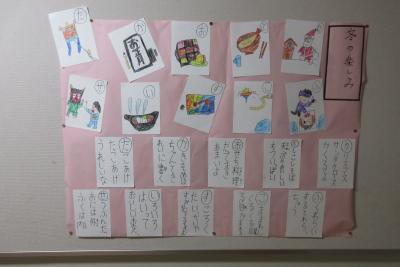冬の楽しみカルタの掲示です。約2週間で冬休み、3週間でお正月ですね。楽しみな季節です。