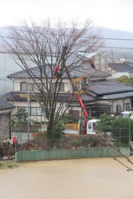 バックネット裏のケヤキの木が上のほうから色づいてきています。ちょっといい感じです。