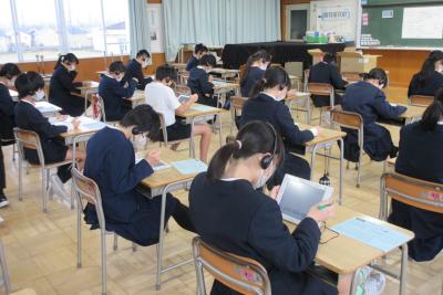 川北中学校でレベルアップ川北会議が開催され、6年生の代表者が直接、ほかの6年生は教室でリモート参加しました。メディアとの付き合い方について、川北町4小中学校で話し合いをしました。