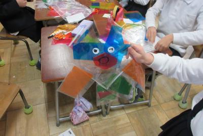 新館1階には1年生の、2階渡り廊下には3年生の図工作品が並べられています。どちらも身近なものを利用した作品です。