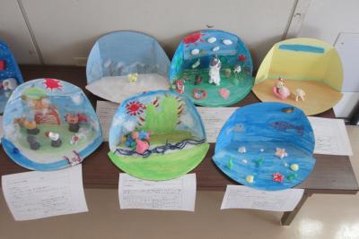 2階の渡り廊下に、3年生と5年生の図工の作品を展示しています。ちょっとした作品展のようで、とてもきれいです。