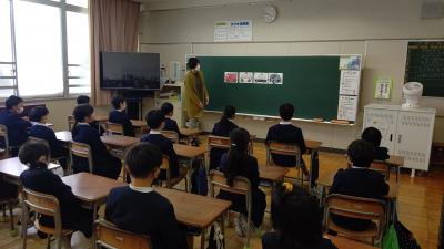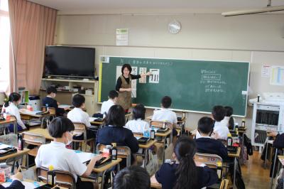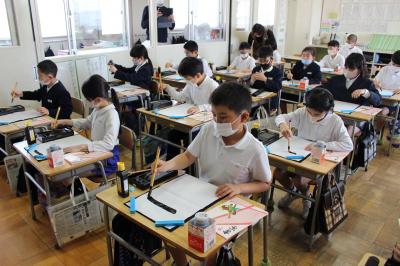 今日の4年生の書写の時間に、ゲストティチャーとして、川北町にお住いの山本真弓先生においでいただき、毛筆の時に気をつけることなどを教えていただきました。