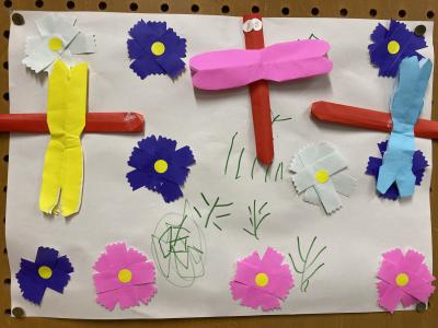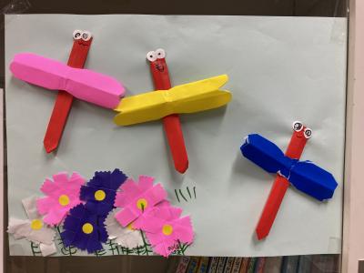 みのり・のぞみ学級では、「秋探し」としてコスモスと赤トンボを折り紙で作りました。