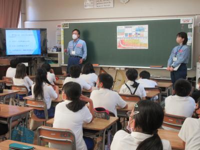 金沢河川国道事務所の方々に来ていただき、水害のときの身の守り方について学んでいます。