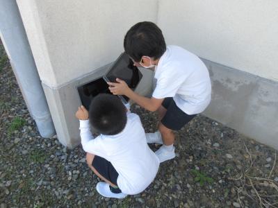 体育館のかげでいきものさがしをしています。見つけたいきものはタブレットで撮影して、発表します。