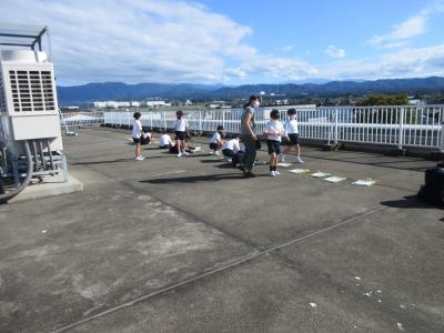 屋上で1日のかげの動きについて調べました。天気がよく、見晴らしもよく、気持ちのよい観察となりました。