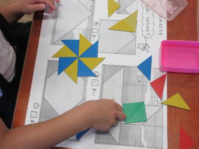 三角形をつかって、いろいろな形づくりをしています。風車みたいな形を上手に作りましたね。