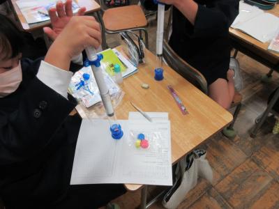 とじこめた空気について調べています。ぎゅっと押すと体積は?手ごたえは?どうなるかな。