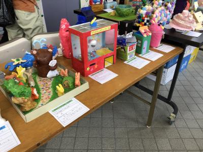 夏休みに作った貯金箱の展示を川北郵便局で行っています。9月24日までです。ぜひご覧ください。