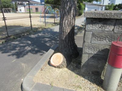 運動場横の松が病気になってしまい、残念ながら切りました。半分は元気です。年輪を見ると、たいへん長い間、学校を見守ってくれていたことが分かります。