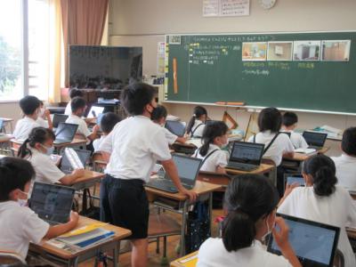 川北町の防災(備え)について調べ、話し合っています。学校にも防災倉庫や防災備品があります。