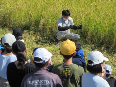 秋晴れの中、稲刈りを行いました。披岸さんやJAの方々のご指導のもと、てきぱきと行なうことができました。