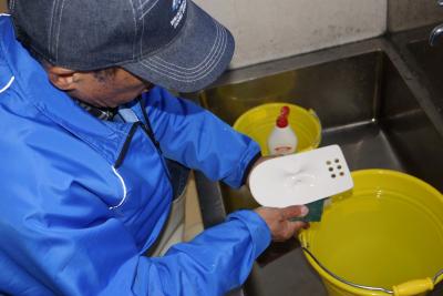 雑巾を固く絞り、奥まで丁寧に水拭きしています。えらい!