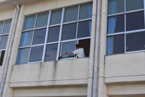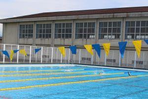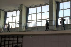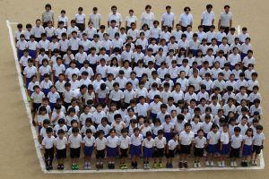 校舎3階の窓には、今年の運動会のスローガンが貼られました。