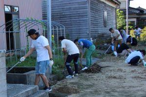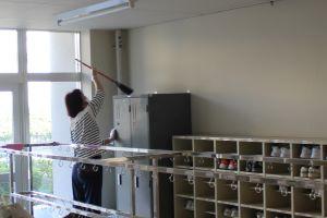 手の空いている人から、机と椅子をを組み立てて、水拭きします。