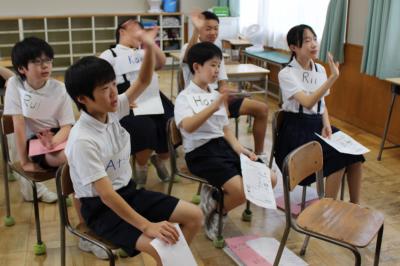 「English クラブ」は、4年生が一人、5年生が一人、6年生が二人の4人です。