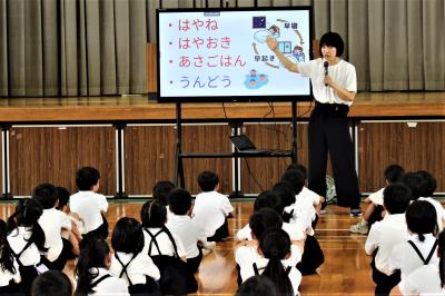「元気な声で、自分からあいさつができたと思う人は、手をあげましょう」