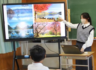 次に、4年生です。4年生は国語科で「調べて話そう、生活調査隊」の単元を学習しています。今日は、各班が調べたことを別の部屋で発表し、それをオンラインで観て修正点などはないか考えていました。他の班の発表を見て、気づくこともいくつかあって、それを自分たちの発表に生かそうとする姿も見られました。