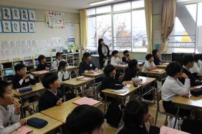 6年生に2年生の頃を思い出してもらおうと、1限目 体育「なわとび」、2限目 音楽「アイアイ」、3限目 国語「スイミー」、4限目 算数「九九」を披露。4限目の「九九」では、だじゃれをきかせ笑いを誘っていました。