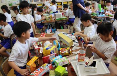 今日は、1年生が図工科の授業で、箱と箱を組み合わせてイメージした物をつくりました。