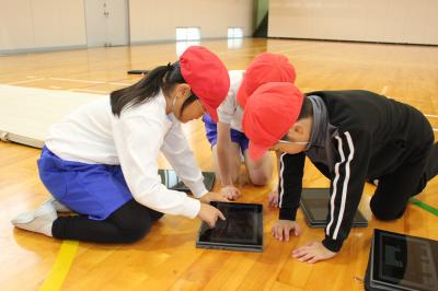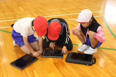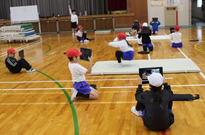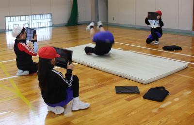 グループで、クロムブックを用い、お友達の前転の様子をビデオで映しています。