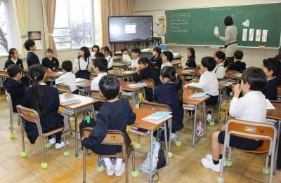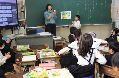 6年生に2年生の頃を思い出してもらおうと、1限目 体育「なわとび」、2限目 音楽「アイアイ」、3限目 国語「スイミー」、4限目 算数「九九」を披露。4限目の「九九」では、だじゃれをきかせ笑いを誘っていました。