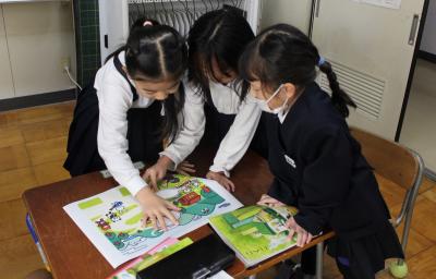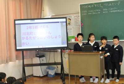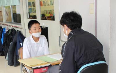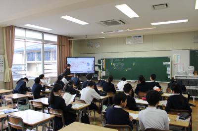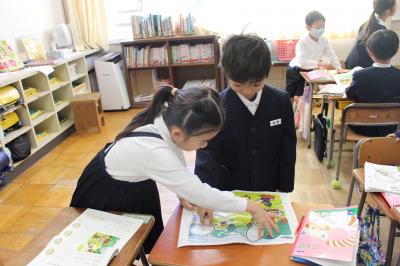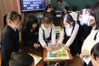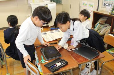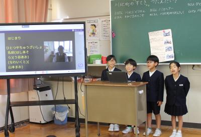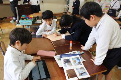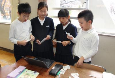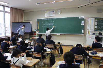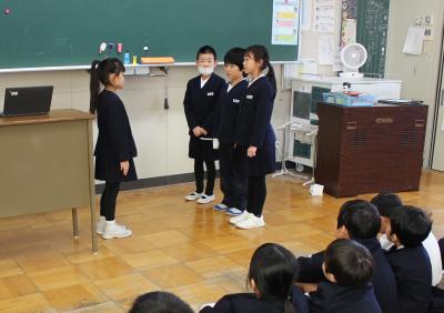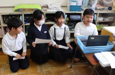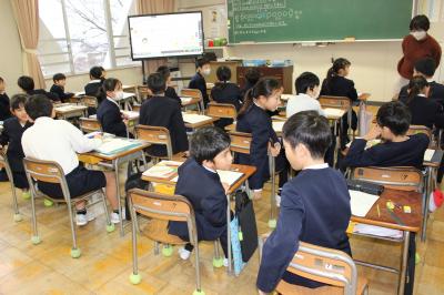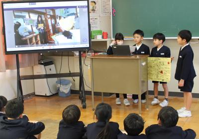 次に、4年生です。4年生は国語科で「調べて話そう、生活調査隊」の単元を学習しています。今日は、各班が調べたことを別の部屋で発表し、それをオンラインで観て修正点などはないか考えていました。他の班の発表を見て、気づくこともいくつかあって、それを自分たちの発表に生かそうとする姿も見られました。
