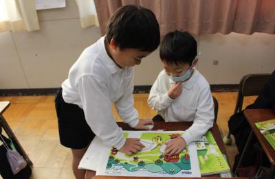 「生活科ボランティア」の方には、1年生に「昔あそび」を教えていただいたり、2年生の地区探検の引率補助をしていただきました。