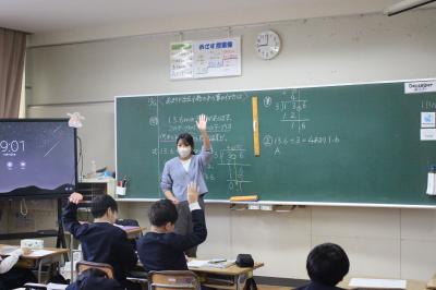 次は、4年生の授業です。4年生の算数では、「小数のかけ算やわり算」を学習しています。今日は、小数のわり算で、あまりが出た時にどうすればよいかを考えました。最初はよくわからなかった子も、友だちと話し合ったり、繰り返し問題を解くことで、わかるようになってきました。