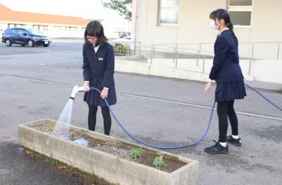 朝、児童玄関前で子どもたちと挨拶をしていると、6年生の環境委員が花壇の水やりに来ました。