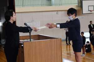 証書授与では、一人ずつ担任から名前を呼ばれて、ステージ中央で私(校長)から証書を受け取りました。