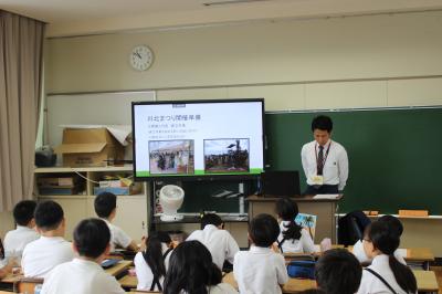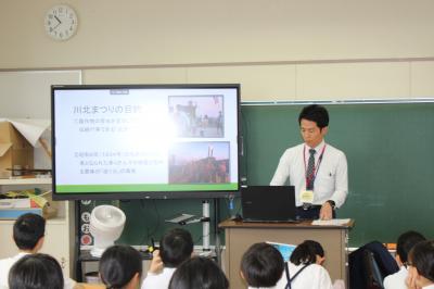 最初に川北町が毎年8月に行っている火まつりについて、写真などを使って説明してくださいました。火まつりがいつから行われているのかやどんな準備をしているのかを詳しく教えてくださいました。子どもたちは、分かったことをメモにとりながら、熱心に聞いていました。