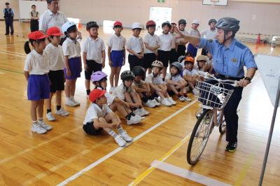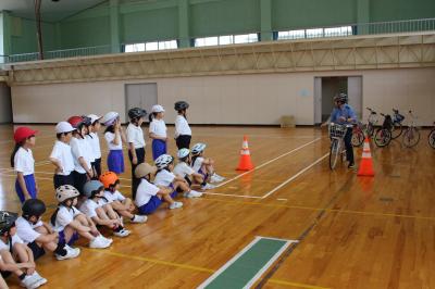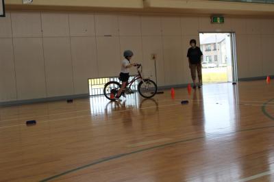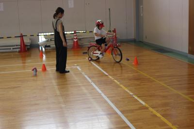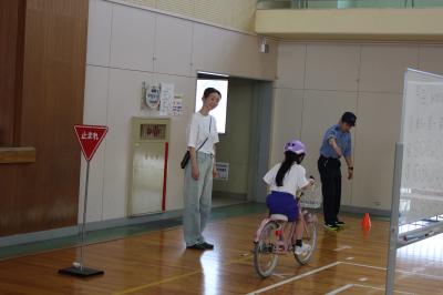 そして、いよいよ3年生が自転車に乗って、順番にコースを回りました。あまり自転車に乗ったことのない児童もいて、最初はおそるおそるゆっくりと乗っていましたが、コースの終わりくらいになると、安定して乗れるようになっていました。最初こわがっていた子も「もう一周まわりたい」というくらい、自信がついた様子でした。