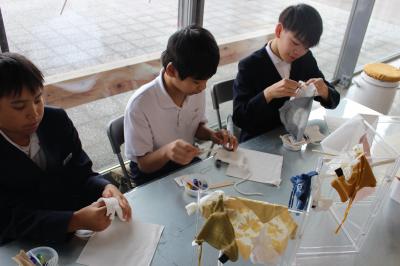 2日目は、午前中に那谷寺と丸八製茶場と九谷焼窯跡展示館を回りました。那谷寺ではガイドさんが案内もしてくださいました。お昼ご飯を九谷満月で食べた後、小松マテーレ工場にも行きました。小松マテーレ工場では、絞り染めの巾着と眼鏡クリーナーを作る体験も行いました。