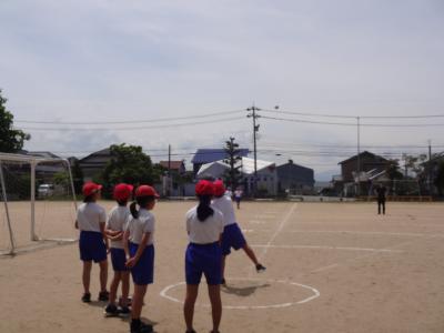 運動場にソフトボール投げのラインが引かれ、各クラス半分に分かれ測定が始まりました。円をはみ出さないように