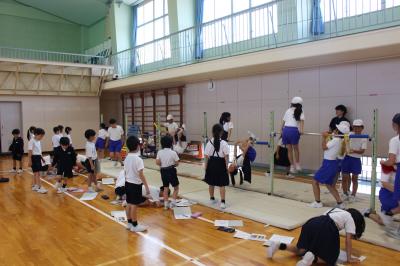 立ち幅跳びでは、手を思いっきり振って、膝を曲げて真剣に跳ぶ姿が見られました。