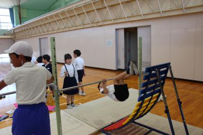 逆上がりが苦手な子は、逆上がりの練習道具を使って練習していました。けるタイミングや回るタイミングをこの道具を使って練習して、できるようになった子もいました。
