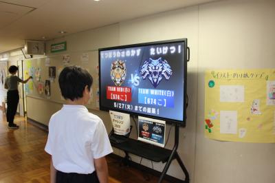 取り組んでできるようになった技の数を教室の前に貼っている名簿に記入しています。その結果を体育委員が毎日集計して、学年別のランキングや赤チーム・白チームのそれぞれの合計ポイントを職員室前の電子黒板に映して、意欲づけもしています。