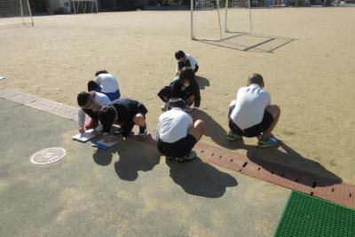 太陽の位置と影の関係を調べています。天気がよくて、絶好の観察びよりです。
