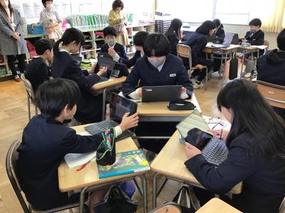 5年1組は、道徳の授業で「挑戦を楽しむことの原動力」という教材で、大谷翔平選手のことをもとに考えていました。5年2組は、国語の授業で「想像力のスイッチを入れよう」の学習をしました。クロームブックを使って、グループで話し合い活動をしました。
