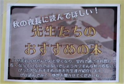 階段横には、先生方からの「 おすすめの物語」の紹介が掲示してあります。