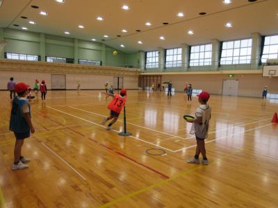 「ティーボール」カーンと打って、守備をしている間にコーンを回って帰ってきたら、得点が入ります。