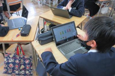 川北小をよくするために話し合っています。パソコン上の付箋にアイデアを書いて、話し合いをしています。