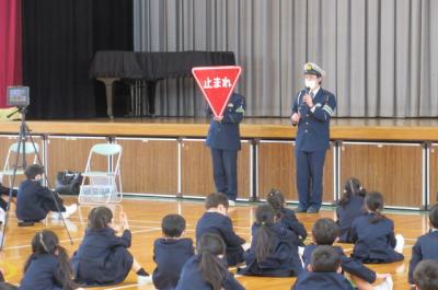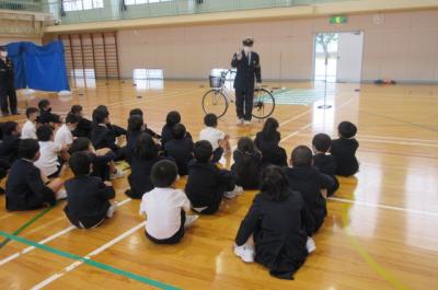交通安全教室がありました。前半は全校対象に、歩くとき、自転車に乗るときのルールについて教えてもらいました。