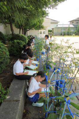 植えた野菜の観察をしています。ミニトマトやなすがたくさん実ってきました。