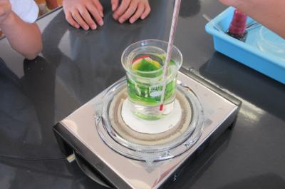 葉のはたらき(日光との関係)について調べています。今は、あたためて柔らかくなったアサガオの葉をエタノールにつけているところ。温度は70℃くらい。