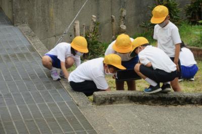 生きものを探してタブレットで写真を撮ろうとしています。生きものクイズをつくる計画です。