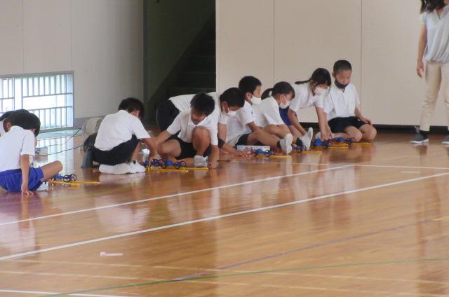 風の力やゴムの力を利用して、車を走らせました。一番速いのは?遠くまで行くのは?