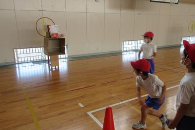 たまあてゲーム(?)をしていました。はやく段ボールを倒したほうが勝ち!