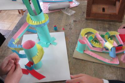 「ころがるくんの旅」工夫して作っています。さまざまな作品があり、完成が楽しみです。